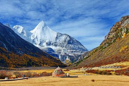尤其亞丁匯集了稻城秋天所有濃烈的顏色:純凈的藍(lán)天,飛過(guò)白云間的蒼鷹,風(fēng)格獨(dú)特的藏鄉(xiāng)建筑,金黃的秋楊,深紅的沼澤,波光粼粼的小河,多么美的一幅油畫(huà),是人們歸隱田園的夢(mèng)想天堂。