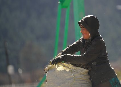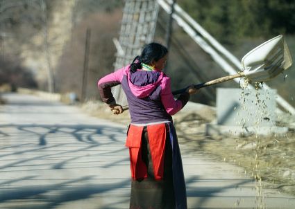 一群孩子會準(zhǔn)時來小二樓叫我,要去密林,要去山岡,要去尋找?guī)в薪?jīng)文的瑪尼石,還要去那個神秘的洞頂。比孩子們更準(zhǔn)時的是掛在小二樓上的四個大喇叭,鳥雀剛醒來,廣播就開始了,就必須要起來了。穿過巷道,和打豆子的人們一起享受勞動的幸福。我們在一起,等待著下午的廣播,因?yàn)閺V播會給我們帶來無盡的喜悅。