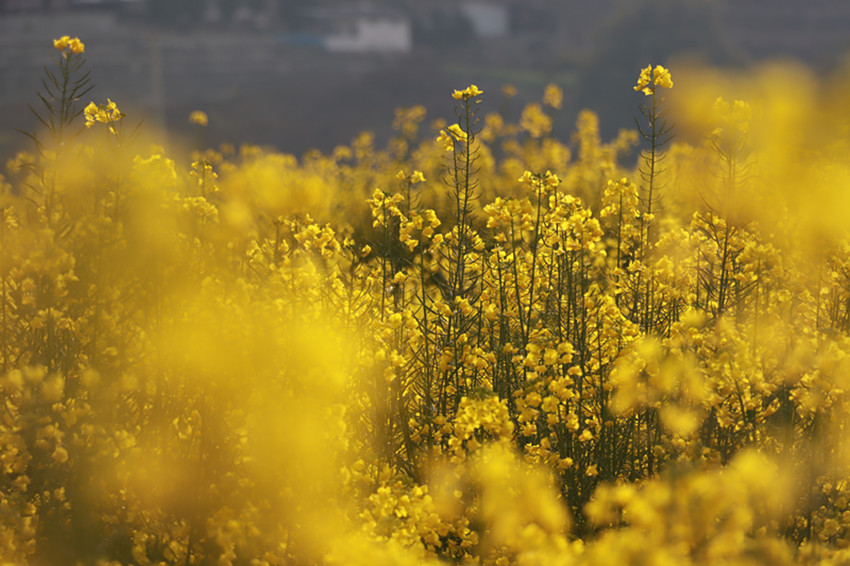 金黃的油菜花美美地填滿了整片田野,與藍天白云、村落人家相映成趣。順著田埂漫步花海,花香四溢,沁人心脾。微風(fēng)吹來,一朵朵油菜花在風(fēng)中搖曳,嬌嫩的花蕊隨風(fēng)飄動,仿若身著金黃色輕紗的少女在翩翩起舞,靈動迷人。在花叢中飛舞的蜜蜂為花田增添了靈動和生氣,一掃冬日的沉悶,帶給人明快舒朗的好心情。成片盛開的油菜花與前來賞花的游人相映成趣,游人們拿出手機、相機,尋找最佳的角度,定格醉人美景,讓人忍不住贊嘆:好一番田園美景。