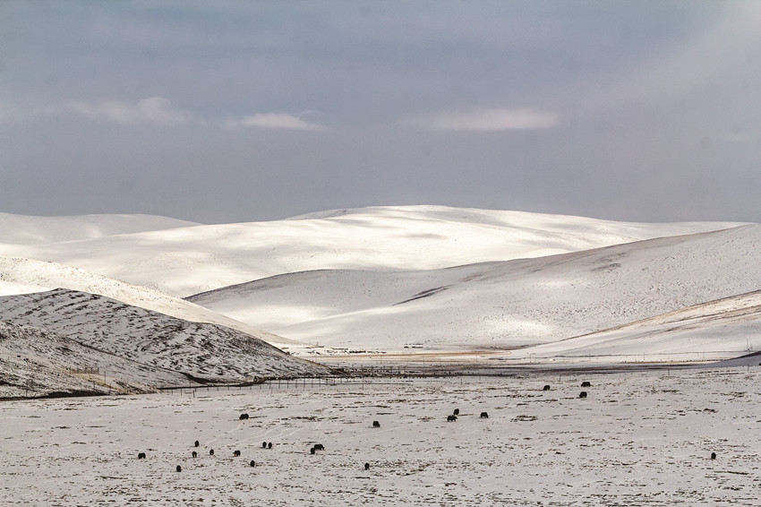 雪后的高原,藍(lán)天白云,大地和連綿到天邊的遠(yuǎn)山,就像被什么過濾了一樣,一片潔白,滿眼凈是純凈的美,全然沒有冬日的荒涼,更顯空靈、大氣,盡顯高原獨(dú)特的美。白雪覆蓋的村莊、牧場被河流、大路小徑串連起來,寧靜、秀美,像一幅幅天然的水墨畫,美不勝收。