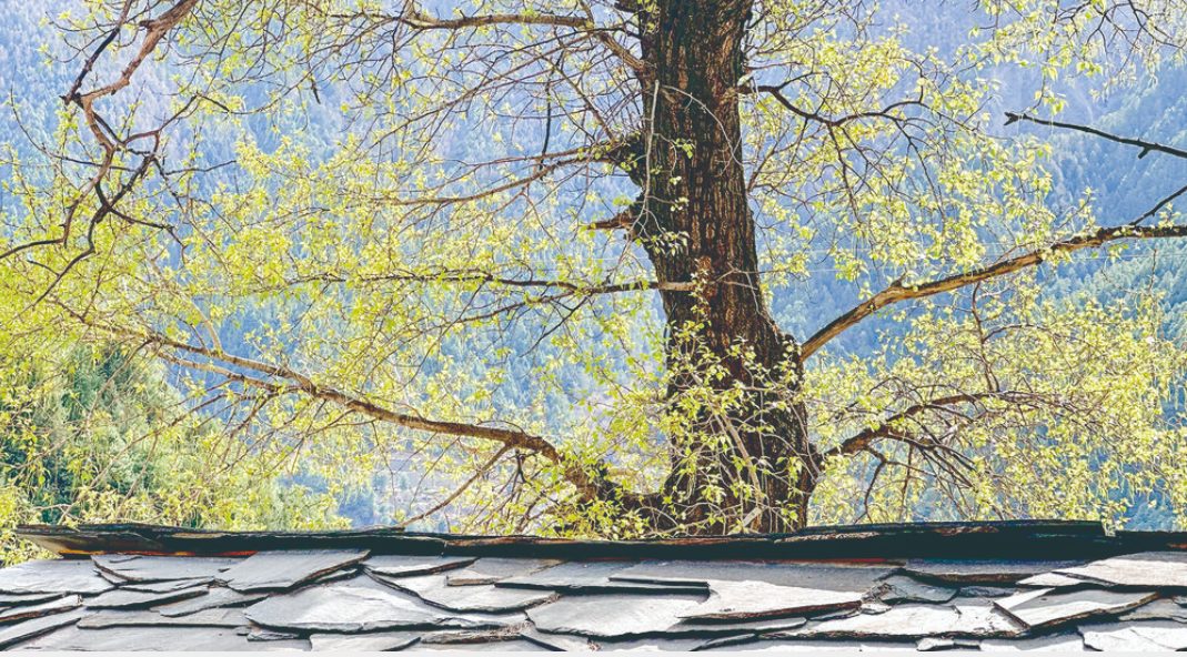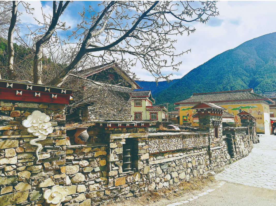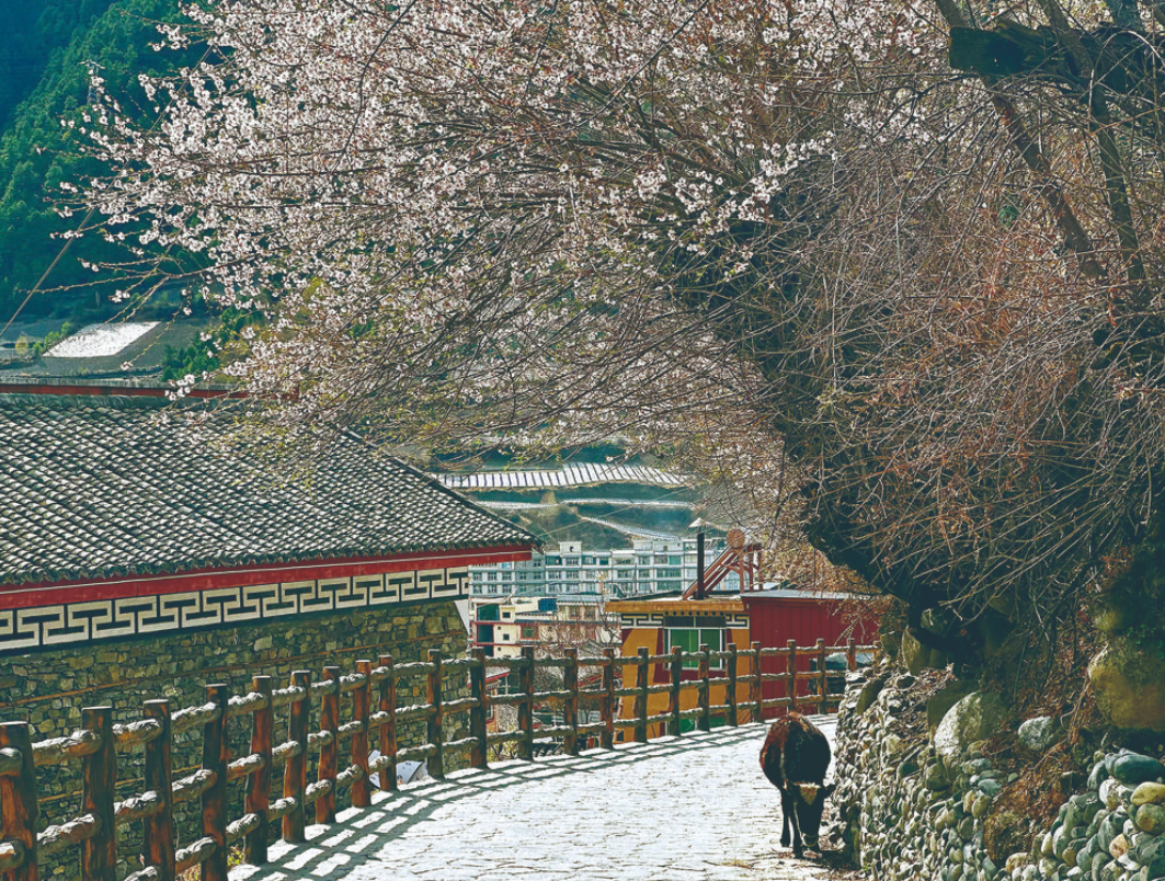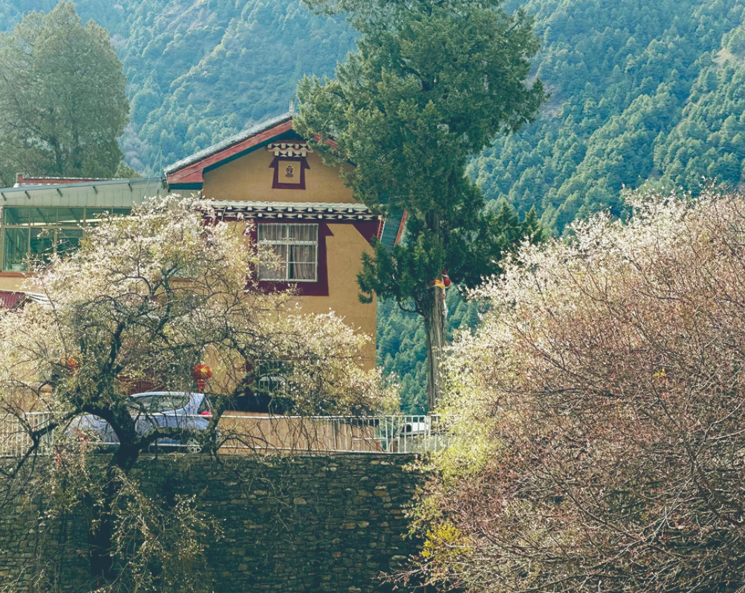 腳下的路在不停地延伸,一條或幾條通向了寨子深處,山桃花和果樹林那么茂密,只能望見藏房的瓦屋頂和彩繪木窗。