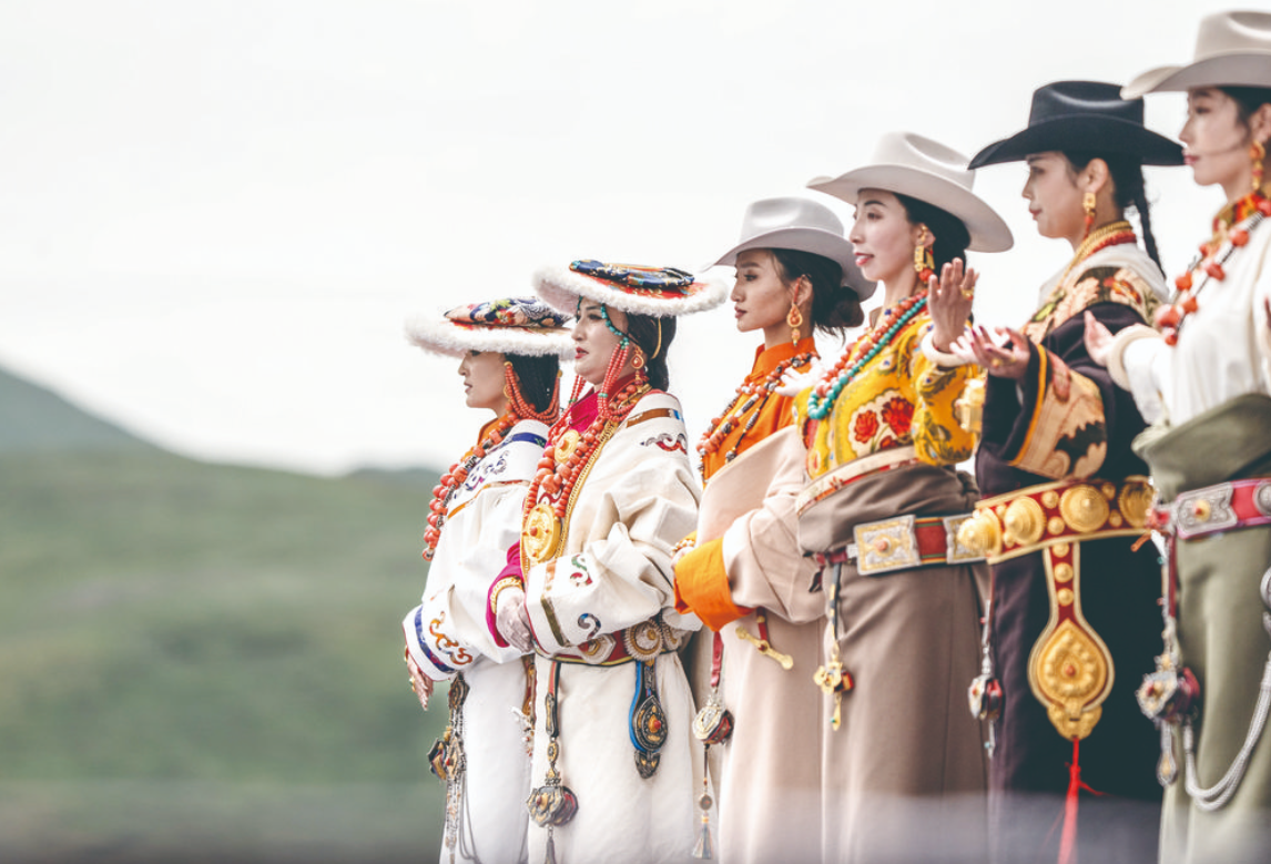 8月10日,一場藏族服飾秀在四川省色達縣第二屆“福地色達·金馬之邀”游牧文化旅游季啟幕儀式上舉行,吸引眾多游客觀賞。圖為當?shù)夭刈迦罕姶┲刈宸椷M行展示。