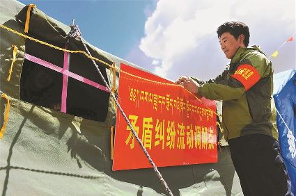 下壩片區(qū)的打色卡蟲草采集駐點(diǎn),林立的帳篷中,一面黨員服務(wù)隊(duì)的紅旗格外引人注目。這支黨員服務(wù)隊(duì)由來(lái)自當(dāng)?shù)蒯t(yī)院、派出所、駐村第一書記等37名黨員組成。一周前,來(lái)自呷洼鄉(xiāng)的藏族群眾降央,進(jìn)山第一天就頭部脹痛,嘴唇發(fā)紫,臉發(fā)青,呼吸困難。服務(wù)隊(duì)的醫(yī)生格曲批立即判斷出這是嚴(yán)重的高原反應(yīng),馬上給他吸氧,服肌苷口服液。待患者癥狀有所緩解后,鄉(xiāng)上派車把他送往縣城接受治療。已康復(fù)出院的降央說(shuō):“要是當(dāng)時(shí)沒有穩(wěn)住病情并及時(shí)送到縣上,我恐怕就兇多吉少了。”“百姓在哪兒,黨員就在哪兒!我們的任務(wù)就是為上山挖蟲草的群眾做好服務(wù)協(xié)調(diào)工作。”理塘縣下壩片區(qū)工委主任洪勇告訴記者。他從2002年開始至今,已連續(xù)十四年在蟲草季節(jié)帶隊(duì)進(jìn)山。服務(wù)隊(duì)中的洛絨丁真原本計(jì)劃在5月18日結(jié)婚,因?yàn)橄x草季的來(lái)臨,將婚禮推遲到了7月份。
