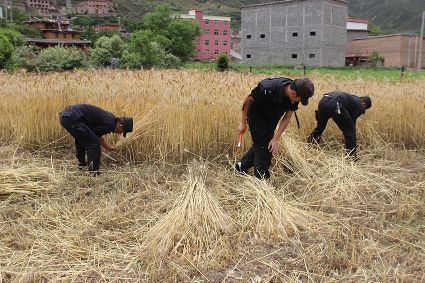 “不能讓鄧珠家成熟了的小麥爛在地里。”近期,巴塘縣陰雨天氣給當?shù)卮迕袷崭钚←湈聿槐?。該縣夏邛派出所民警自發(fā)來到夏邛鎮(zhèn)河西村特困戶鄧珠家田地,以最快的速度幫助收割、捆綁、脫粒等一系列搶收工作。據(jù)悉,夏邛派出所民警在開展“一標三實”工作時,將當?shù)乩щy戶、殘疾戶、五保戶等缺少勞動力的家庭銘記在心,每逢播種秋收都會進行幫助。