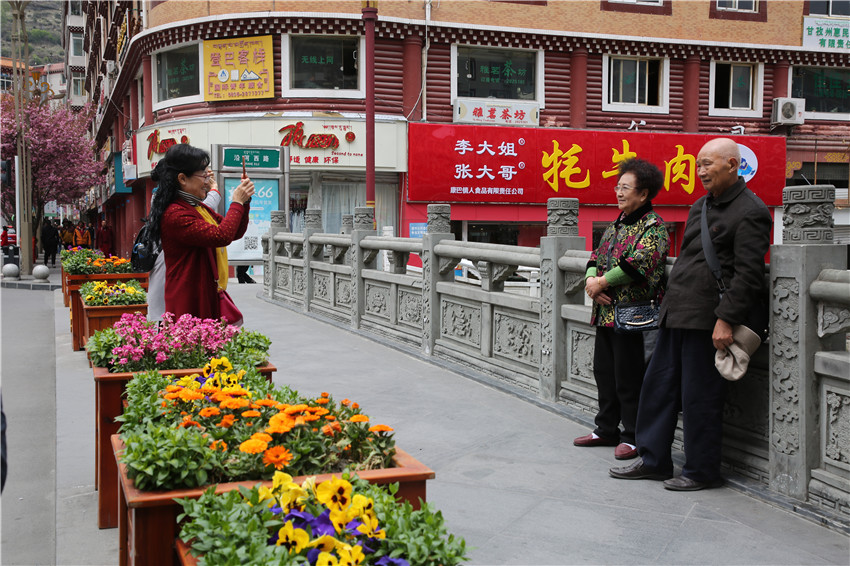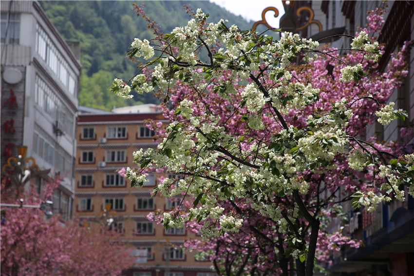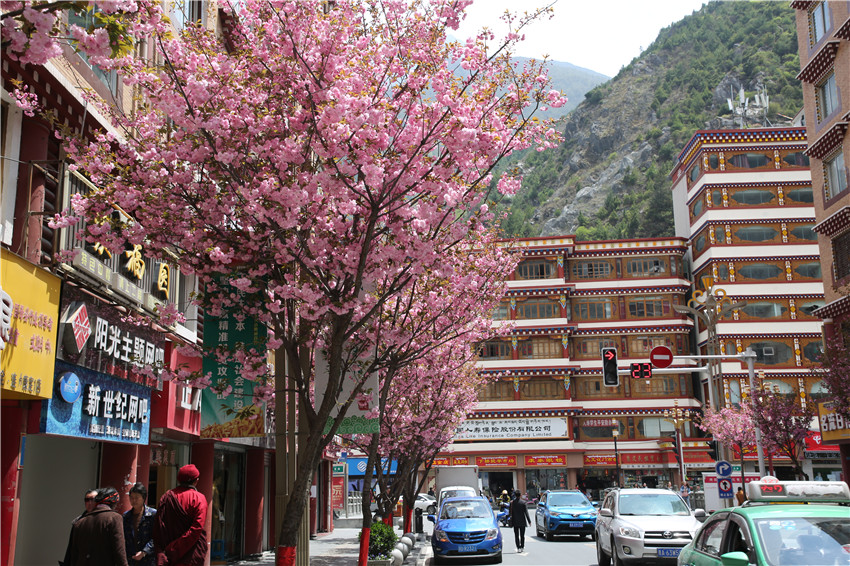 當春天遇見最美的櫻花時,驚艷了整個康定。櫻花與身邊人都將成為春日里的浪漫風景。櫻花之美,美在氣勢,櫻花紛飛,夢幻唯美。每年4月中旬,康定城北門的櫻花綻放后,人們像是約好了一樣聚集到這里,共赴這一場甜美盛宴。這一路繁花似錦,人們穿過枝椏花正盛的櫻花林,穿過粉色海洋,徑直奔向一個浪漫的童話,一路櫻花飄散,一路粉光燦爛。櫻花絢麗繽紛、陸續(xù)綻放,若恰逢一陣春風經(jīng)過,櫻花瓣隨風舞動,猶如紛落的雪花,空氣中浮動著櫻花特有的淡淡香氣,令人不禁懷疑自己置身夢境?!翱刀ǖ拇禾靵淼靡硪恍?,綻放的櫻花,滿街的花草,折多河畔楊柳依依,康定的春天無比驚艷,醉了游人。”周先生一邊拍照,一邊感嘆,他在康定生活了40多年,20年前的康定,可以說找不到像樣的花草樹木,進入新時代,康定城市變美了,城市綠化走在了前面,城市的美譽度舒適度不斷提升??刀ㄖ?,春色滿園,姹紫嫣紅,風光旖旎。
