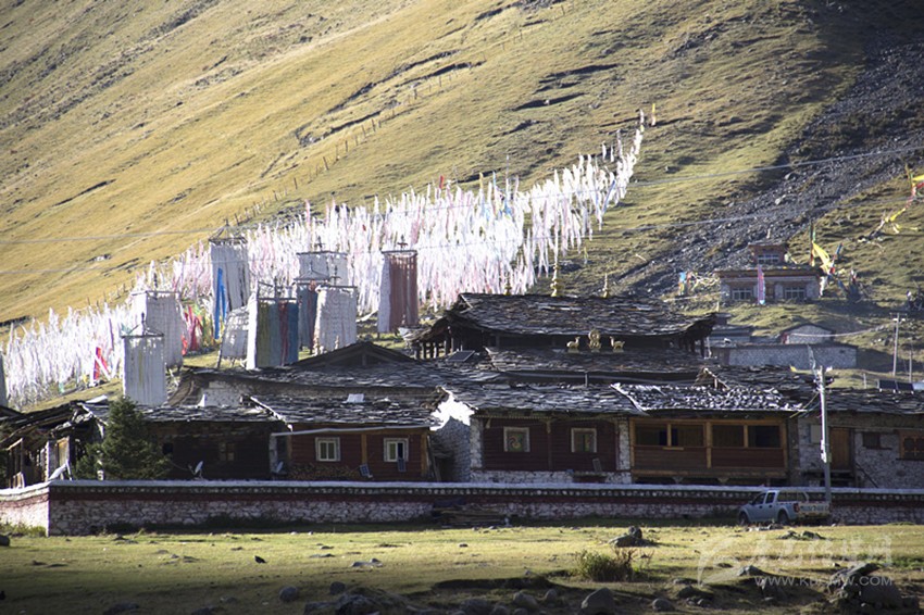 當太陽落進金龍雪山的懷抱,最后一抹余暉斜照在靜靜的莫斯卡村莊上。東邊的小河在斜陽里歡快的流過村莊,莫斯卡的女人在夕陽里,正領著孩子回家。西邊牧歸的男人悠閑的向山下趕著牦牛。村莊背后漫山的經(jīng)幡,在晚風里誦經(jīng)祈福……格薩爾王的傳說就在這樣的時光里,雕琢成了漫山的石刻,在經(jīng)年的歲月里傳頌。