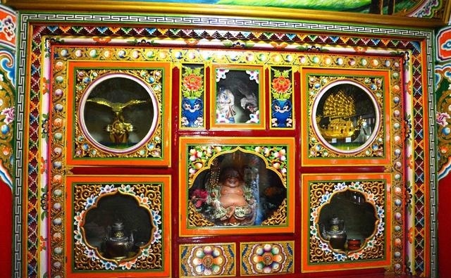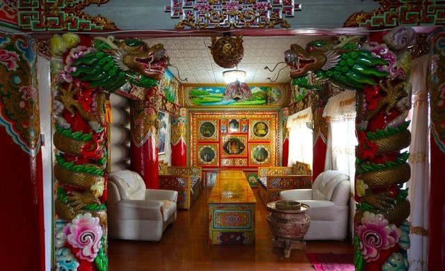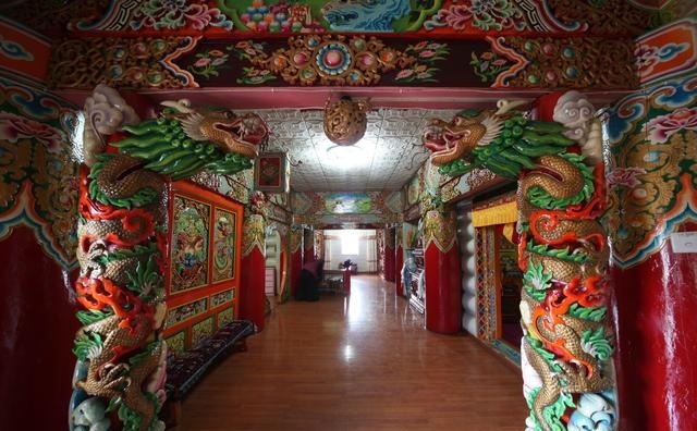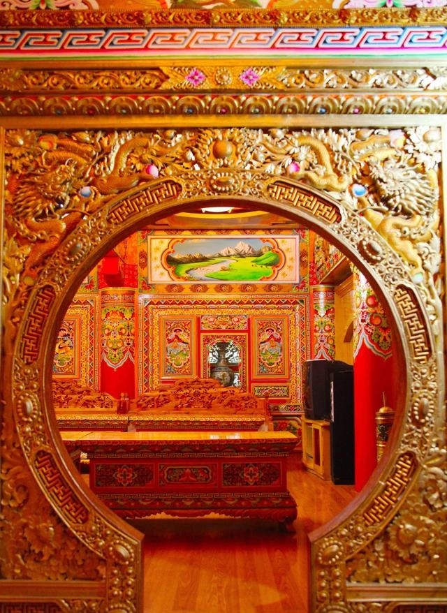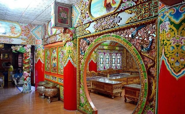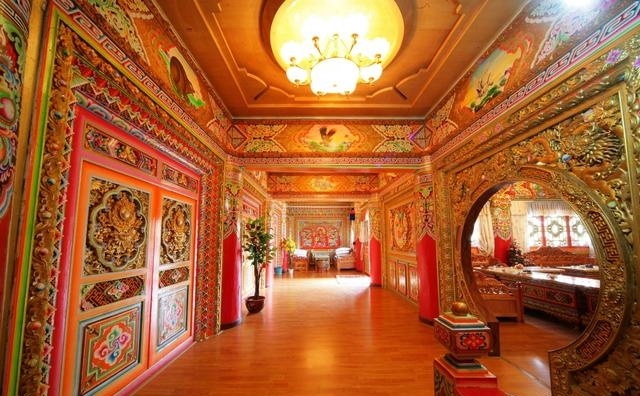 道孚民居室內(nèi)精雕細鏤,描金繪彩,每一個圖案或圖畫就是一個吉祥物或一個傳說。民居客廳陳設(shè)豪華,富麗堂皇,極顯主人的富有;經(jīng)堂供奉佛像,酥油燈長明,是家中的清靜之地;臥室多用箱式或椅式藏床,陳設(shè)溫馨而別具風(fēng)情。