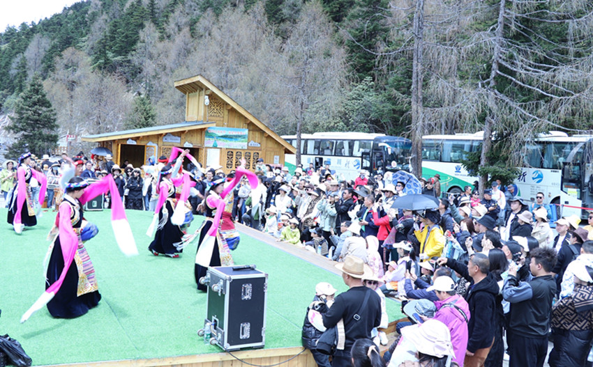 春雪消融,大地復(fù)蘇,高原上肅穆的景色正變得郁郁蔥蔥、多姿多彩起來。5月1日,康定情歌(木格措)風(fēng)景區(qū)天氣晴好,高山杜鵑在山澗中次第開放,景區(qū)內(nèi)人流如織,游客有的是一家老小有說有笑,有的是三五好友打卡拍照。行走在高山湖泊造就的自然環(huán)境中,耳畔是鳥兒和河水流動的和聲,信步林間,牧歌牛群,木格措清凜可人。在木格措觀景臺,還上演了14場藏族非遺歌舞,歡快的舞蹈和秀麗的風(fēng)光讓游客沉醉其中、留戀忘返。