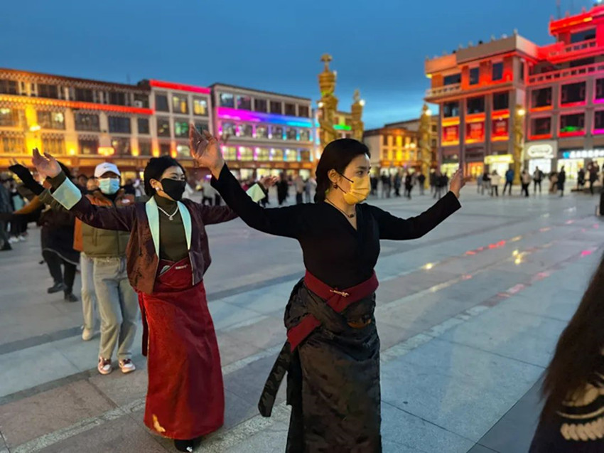 本網(wǎng)訊 每到傍晚時分,色達的金馬廣場上都會準時響起起歡快的鍋莊曲。 舞者們雙手隨音樂自然張開,邁著輕快的步伐,踢腿、揚手、轉圈。游客們有的拿起手機拍照留念,有的則加入鍋莊舞的隊列。