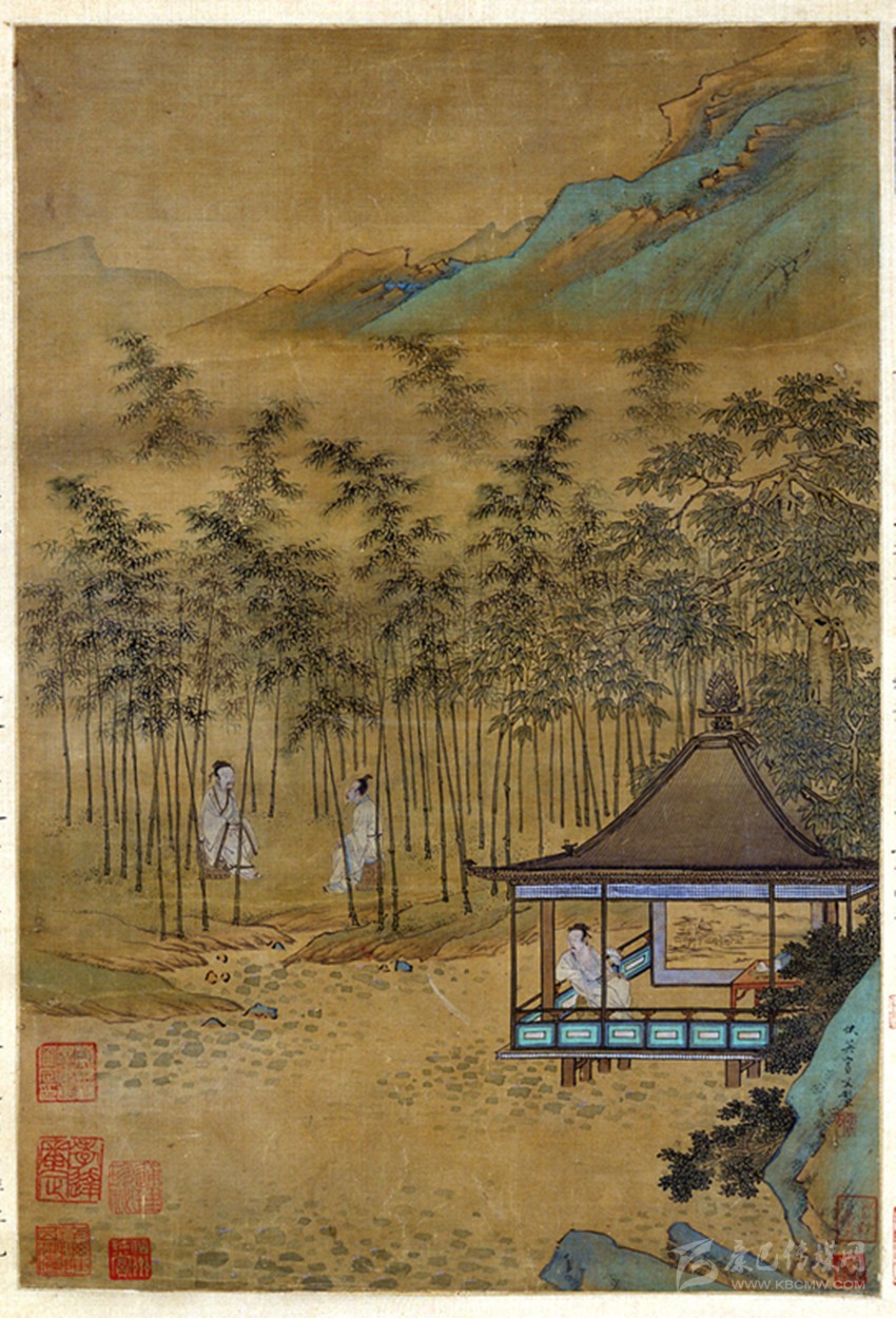 此圖意境極像唐代詩(shī)人王維的藍(lán)田山別墅。這里林木茂密,山澗淙淙,館舍、房屋散布其間,每到夏季,山風(fēng)習(xí)習(xí),涼爽怡人,王維和文友們?cè)诖硕认谋苁?,垂釣飲酒,談?wù)撛?shī)文,修身養(yǎng)性,過(guò)著悠閑自在的隱居生活。他在《竹里館》一詩(shī)里寫(xiě)過(guò)自己的隱居快樂(lè)感受:“獨(dú)坐幽篁里,彈琴?gòu)?fù)長(zhǎng)嘯。深林人不知,明月來(lái)相照?!比?shī)格調(diào)幽靜閑遠(yuǎn),仿佛詩(shī)人的心境與自然的景致全部融為一體了。宋朝詩(shī)人楊萬(wàn)里喜歡在皎潔的月光之下,清輝孤影,來(lái)到搖曳的竹林中,聽(tīng)著夏夜里悅耳的蟲(chóng)鳴,夜深氣清,盡管沒(méi)有涼風(fēng)送爽,但是悶熱暑氣頓時(shí)消失,于是他寫(xiě)了一首《夏夜追涼》詩(shī):“夜熱依然午熱同,開(kāi)門(mén)小立月明中。竹深樹(shù)密蟲(chóng)鳴處,時(shí)有微涼不是風(fēng)?!?/span>