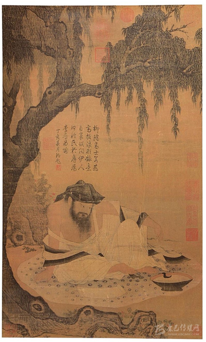 陶淵明曾說(shuō):“夏月虛閑,高臥北窗之下,清風(fēng)颯至,自謂羲皇上人?!币粋€(gè)高人隱士酒后高臥草廬窗下,悠閑自得乘涼的形象躍然紙上。唐代詩(shī)人李白非常向往陶淵明恬淡閑逸、與世無(wú)爭(zhēng)、天人合一的隱逸生活,寫(xiě)詩(shī)曰:“陶令日日醉,不知五柳春。素琴本無(wú)弦,漉酒用葛巾。清風(fēng)北窗下,自謂羲皇人。何時(shí)到栗里,一見(jiàn)平生親。”表達(dá)了對(duì)陶淵明人品和理想的仰慕之情?,F(xiàn)藏于臺(tái)北故宮博物院的宋人《柳蔭高士圖》即是此意境。據(jù)《石渠寶笈》記載,此圖為素絹本著色畫(huà),左方下有孫承澤印,右方下有北平孫氏印,左邊幅有棠村審定、蕉林二印。只知為宋人之作,相關(guān)的背景則無(wú)從查考。畫(huà)中為一棵古柳樹(shù),樹(shù)干虬曲剛勁,枝葉繁茂。樹(shù)下一翁,美髯飄忽,袒胸露腹,頭戴葛巾,赤足席地而坐。坐前有一幅展開(kāi)的手卷,酒樽滿(mǎn)盈,淺斟低酌。表面上看此翁雙目聚神,凝視手卷,實(shí)則已是眼餳耳熱,醺醺然不勝桮杓。清乾隆皇帝對(duì)《柳蔭高士圖》十分喜愛(ài)欣賞,在畫(huà)上御筆題詩(shī)云:“柳蔭高士若為高,放浪形骸意自豪。設(shè)問(wèn)伊人何姓氏,于唐為李晉為陶?!鼻〉壅f(shuō),這位高士如是唐人就是李白,如是晉人便是陶淵明。但是從服飾和環(huán)境看,應(yīng)是五柳先生陶潛也。這幅圖所表現(xiàn)的就是“心靜自然涼”。