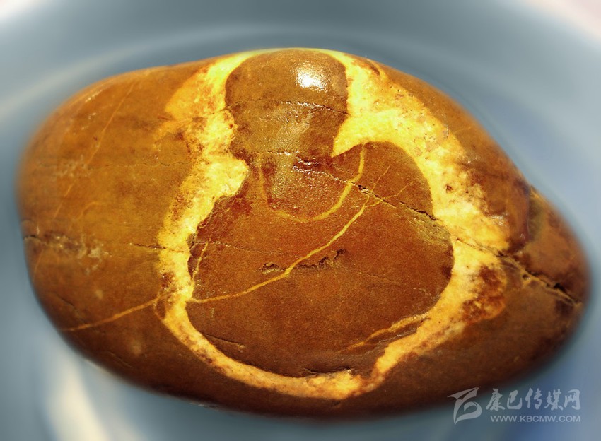 作為一個(gè)無組織的業(yè)余獨(dú)行淘石者,經(jīng)過數(shù)年的摸、淘、琢磨,我悟出:發(fā)掘趣石最重要的是要獨(dú)具慧眼慧心,會(huì)讀石紋。是否讀懂石紋,決定著一塊石頭是頑石還是奇石的命運(yùn)。這是一件很難的事,不僅要運(yùn)用你獨(dú)特的審美視角,還得發(fā)揮你豐富的想象。有時(shí),為了讀懂一些石紋,我會(huì)抱著這塊石頭如考古學(xué)家般仔細(xì)琢磨,從正面、側(cè)面,再到背面,又從左邊旋到右邊,或者上下顛倒來打量……一番冥思苦想,會(huì)意會(huì)神,直到靈感涌起、慧心頓悟,尤如洞天石扉訇然中開,眼前的頑石拙巖,頃刻便化為藝術(shù)珍寶,令我欣喜若狂。正如悉達(dá)多說:“這塊石頭是石頭,它也是動(dòng)物,也是神,也是佛,我敬重它和熱愛它,并非因?yàn)樗谐蝗諘?huì)變成這個(gè)或那個(gè),而是因?yàn)樗缇褪沁@一切,一直是這一切?!背錆M靈性的石頭在你和美妙的自然間搭起了一座通靈的橋梁。淘得趣石,還需緣分。就像人與人的相遇講究緣分,遇到心儀的石頭也講究緣分天助。有年春節(jié),我與父親去河邊轉(zhuǎn)游,面對(duì)涪江寬闊的石灘,我的淘石癮又犯了。但出門前答應(yīng)過父親,這次只逛不撿石頭。我知道老爸心疼我一個(gè)女子大過年的撿石頭。河邊冷,且石頭扛起來很重,手與衣服都會(huì)弄得很臟。我邊陪父親漫走閑聊,眼睛卻止不住往河灘逡巡,仍希望無意中淘到中意的石頭。走著走著,我發(fā)現(xiàn)有一群鳥歡唱著從遠(yuǎn)處一個(gè)石堆飛起,冥冥中感覺那里有寶貝,遂向老爸懇求,過去看一下就回來。來到那個(gè)石堆中心,幾乎不費(fèi)什么功夫,就看到一塊橢圓形石頭上有著一個(gè)自帶金色佛光圈的如來佛半身像。我怔住了,有點(diǎn)不敢相信如此幸運(yùn),蹲在那里久久打量。老爸隨后趕過來,看到佛像石,連連贊嘆了好幾句“太神奇了”。然后,他毫不猶豫地就幫我把石頭搬起來就走。回到家中,如獲至寶的我,趕緊清洗石頭,在清水的滋潤(rùn)下,佛像的輪廓更加清晰。頸上的佛珠、袈裟線也分明,細(xì)看令人叫絕的這竟是一尊三面佛:正面、左側(cè)向、右側(cè)向均是佛。而在此石背面,也清晰出現(xiàn)了一個(gè)草書的“吉”字,真令人喜出望外。吉佛石,就這樣神奇地走進(jìn)了我的生活,讓我相信一切緣分都是可遇不可求的。