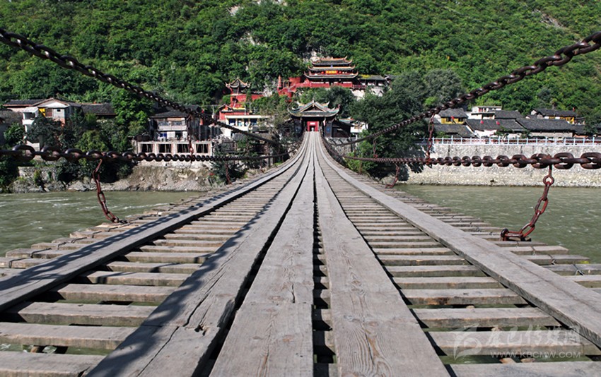 站在岸頭眺望,不遠(yuǎn)處凌空橫跨一座懸掛式的鐵索橋,長(zhǎng)虹般地飛躍顯示出它的磅礴氣勢(shì)與雄壯高大,波濤滾滾的大渡河,像千萬匹脫韁的怒馬,從峽谷中大聲吼叫著飛奔而來砰然萬里;行人在橋面上走動(dòng),仿佛在蕩秋千,腳下漂浮不定,步履蹣跚。人數(shù)稍多時(shí),橋面便晃晃悠悠,感到頭重腳輕,想踩穩(wěn)腳步著實(shí)不易。洶涌澎湃的狂濤讓人瞬間感覺暈暈乎乎,顫顫巍巍。此情此景,印證了流傳在當(dāng)?shù)乩习傩罩械膬删浯蛴驮姡捍蠖珊永锢藵凉F索橋上打閃閃;此時(shí)此刻,游客才真正體驗(yàn)和感悟得到紅軍22勇士當(dāng)年冒著敵人的槍林彈約,飛奪瀘定橋時(shí)有何等的艱難與險(xiǎn)阻……