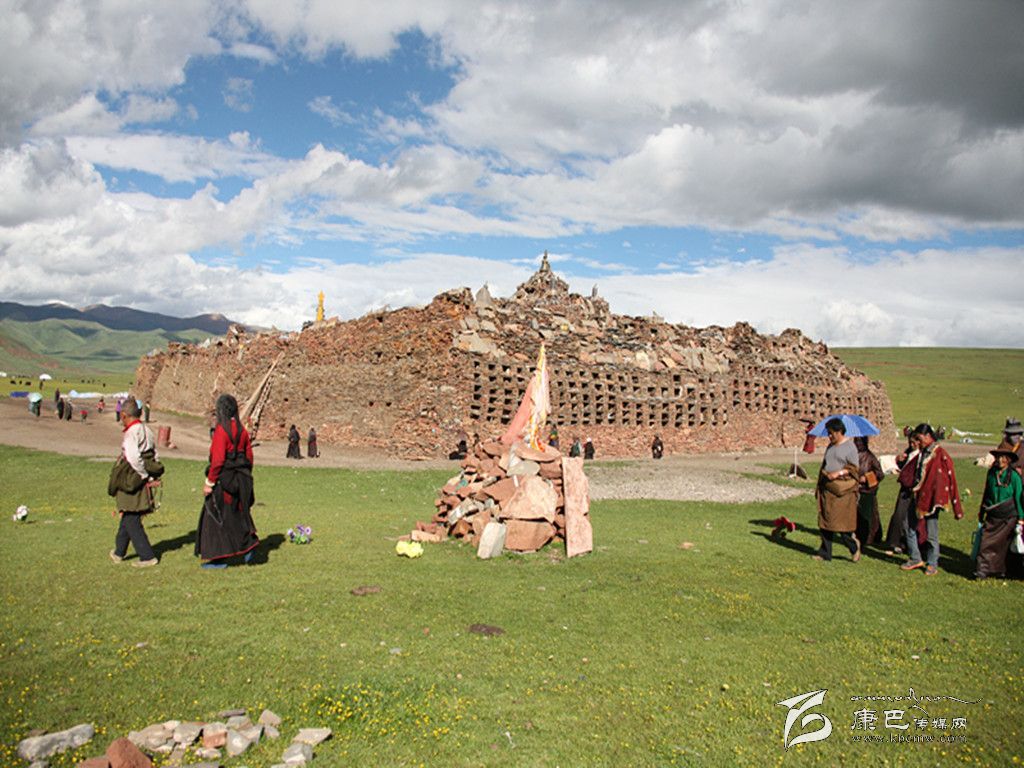 吃完午飯后,大家便走向松格瑪尼石經城。短暫的煨桑儀式結束后,一匹匹高頭大馬繞著石經城飛跑,隆達撒向半空,飄散在雨后的草原上。隨后,專家們走進石經城,挨個頂禮了一處石刻造像,據說,這一處石刻造像具有加持力,十分靈驗。考古專家們和記者繞松格瑪尼石經城走完一圈后,便離開,前往須巴神山。