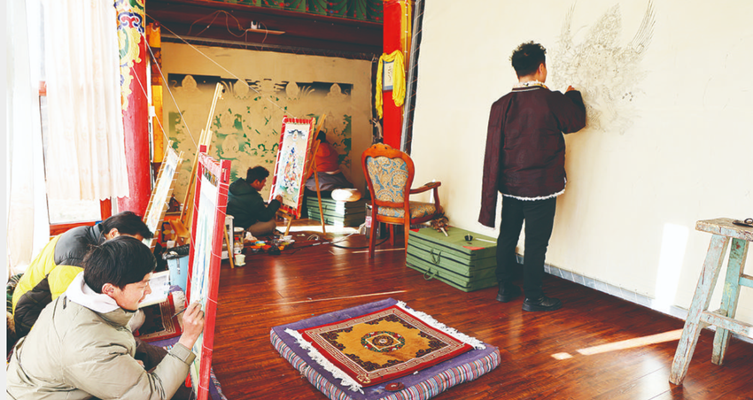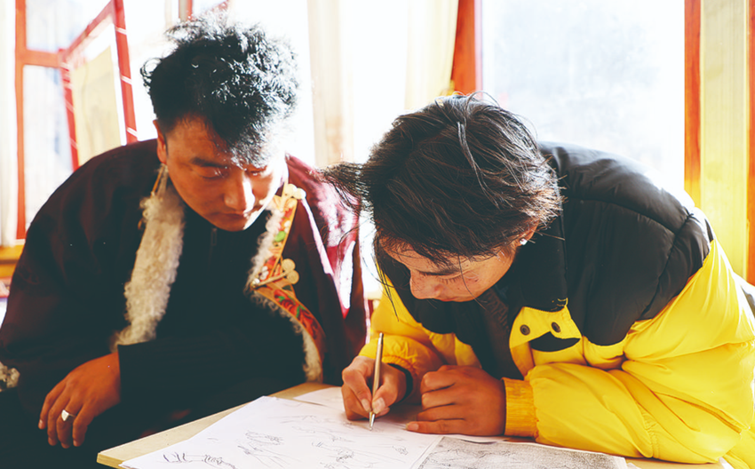 在繪畫工藝室里,筆者看到,其麥正在耐心指導(dǎo)一名學(xué)徒,“這里需要輕輕勾勒,不能太用力?!睂W(xué)生聽著其麥的教學(xué),時(shí)而輕蘸顏料,時(shí)而勾勒線條,時(shí)而仔細(xì)端詳……其麥在家里以集中辦學(xué)的方式,為來自河坡鎮(zhèn)普馬村的貧困家庭子女共二十余人傳授門薩唐卡繪畫技巧,經(jīng)過耐心教學(xué)、傾心相授,現(xiàn)在這些學(xué)員大都掌握了門薩唐卡繪畫技藝。