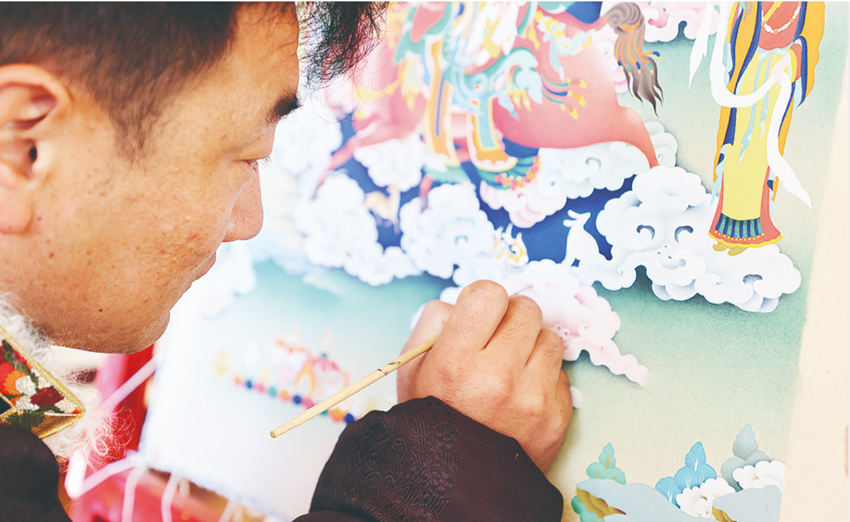 一幅好的唐卡,不僅體現(xiàn)了畫師的精湛技藝,同時(shí)也體現(xiàn)了畫師對(duì)傳統(tǒng)文化的深刻理解,每幅作品不僅傾注了畫師的大量心血,同時(shí)也傾注了畫師的豐沛情感。白玉縣的門薩唐卡作為藏文化藝術(shù)的一種繪畫形式,有其獨(dú)特的傳統(tǒng)工藝和鮮明的民族特色。在其傳承和發(fā)展的過程中,又吸收和借鑒了周邊地區(qū)的藝術(shù)形式,形成兼容并蓄而又獨(dú)樹一幟的繪畫風(fēng)格,具有很高的藝術(shù)價(jià)值。