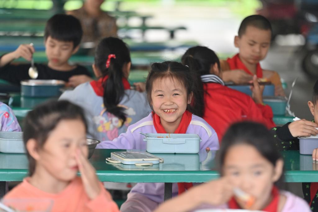 ??5月31日,廣西柳州市柳江區(qū)三都鎮(zhèn)覺山教學(xué)點,學(xué)生們在吃營養(yǎng)午餐。