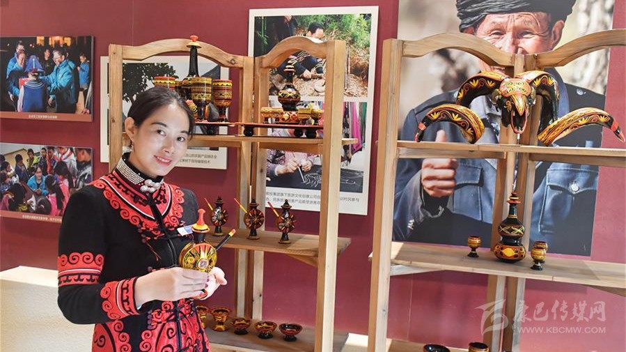 9月7日,在景區(qū)工作的彝海村村民馬嘿補(bǔ)吉莫展示彝族特色手工藝品。新華社記者 孫瑞博