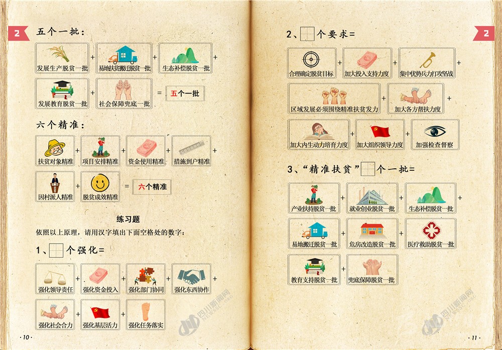 四川新聞網(wǎng)成都8月26日訊 又是周三啦?說好的脫貧攻堅小課堂如期而至!目前,打贏脫貧攻堅戰(zhàn)進(jìn)入最后沖刺的關(guān)鍵階段,四川還有很多硬仗要打,很多“硬骨頭”要啃,防止返貧致貧任務(wù)繁重,脫貧攻堅工作力度還需要加強,面臨的困難和挑戰(zhàn)依然十分艱巨。為了深入推進(jìn)精準(zhǔn)扶貧精準(zhǔn)脫貧,奪取全省脫貧攻堅收官之戰(zhàn)全面勝利,本課采用上一課剛剛學(xué)到的數(shù)字來總結(jié)歸納了脫貧攻堅政策和方法的關(guān)鍵知識點,以便讓廣大同學(xué)進(jìn)一步掌握這些政策、運用這些方法,提高政策受益覆蓋面及知曉率,確保各項政策落到實處。
