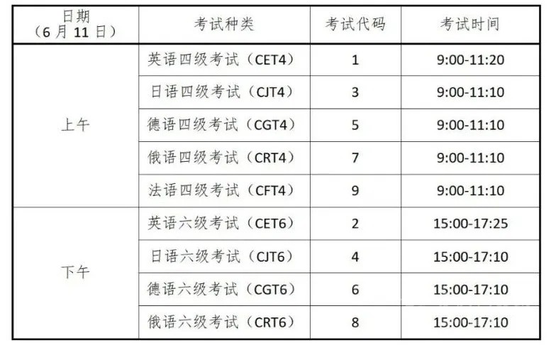 CET考試時(shí)間為6月11日,開考科目為英語、日語、德語和俄語4個(gè)語種的四級和六級,法語四級。具體場次安排如下: