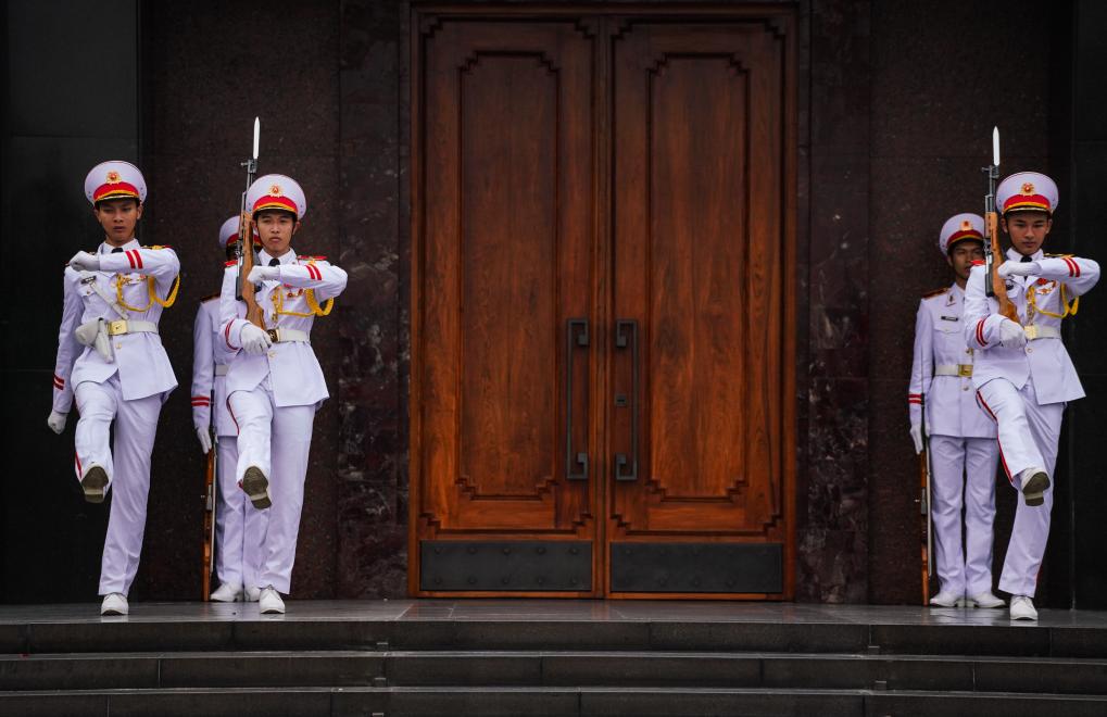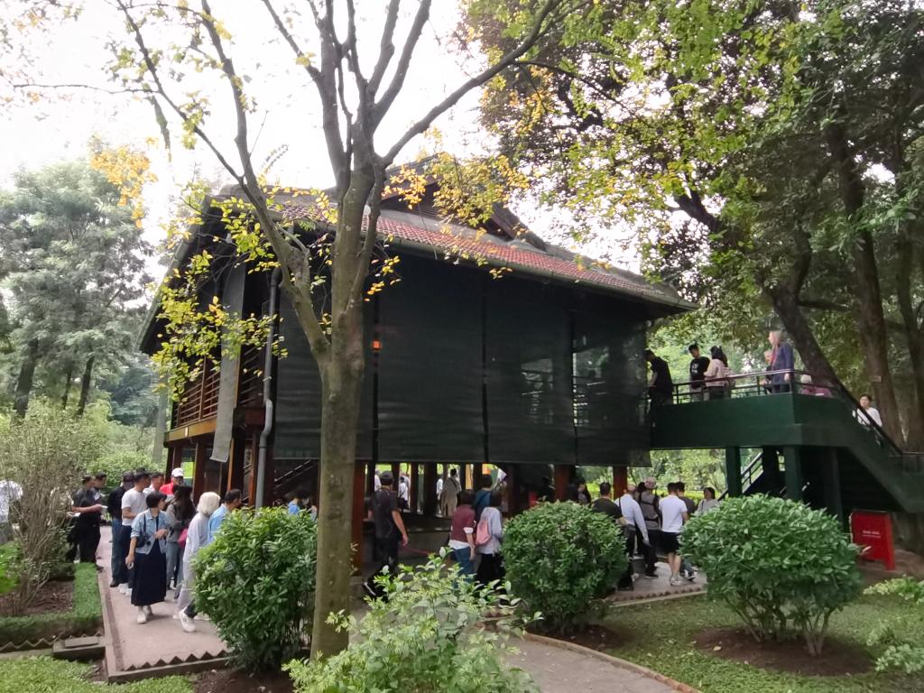 在河內(nèi)地標(biāo)巴亭廣場一側(cè),坐落著胡志明陵和胡志明故居。記者抵達(dá)廣場時,守衛(wèi)胡志明陵的儀仗兵正在舉行換崗儀式,眾多民眾和游客高舉相機或手機,記錄下這莊嚴(yán)肅穆的一刻。胡志明陵北側(cè)的胡志明故居內(nèi),各國游客排起長隊,在他曾長期居住和工作的高腳屋下駐足留影。