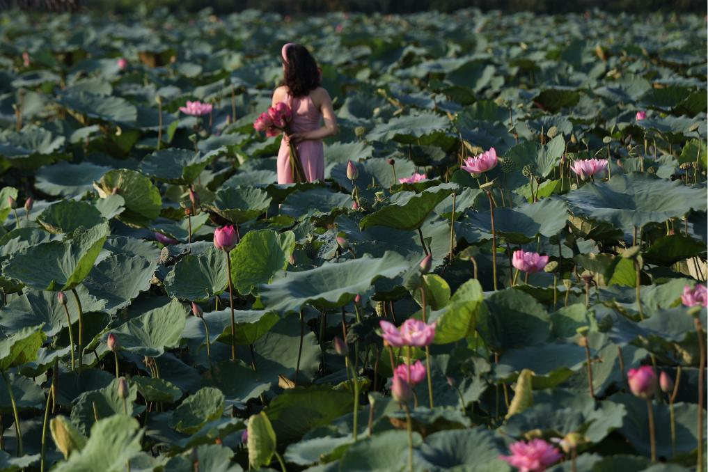 這是2020年7月15日,一名女子在越南首都河內(nèi)西湖畔的荷花叢中留影。