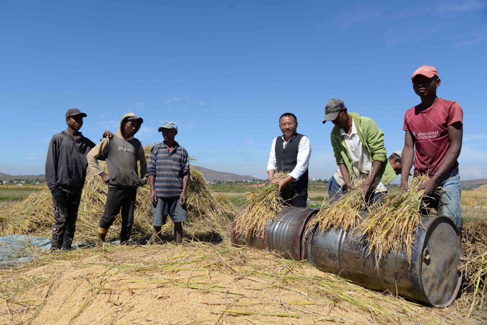 在馬達(dá)加斯加首都塔那那利佛附近的馬義奇鎮(zhèn),中國雜交水稻技術(shù)專家胡月舫(右三)在中國國家雜交水稻工程技術(shù)研究中心非洲分中心的試驗田里和當(dāng)?shù)剞r(nóng)民一起收獲水稻(2023年5月12日攝)。新華社發(fā)(西塔卡·拉喬納里松攝)