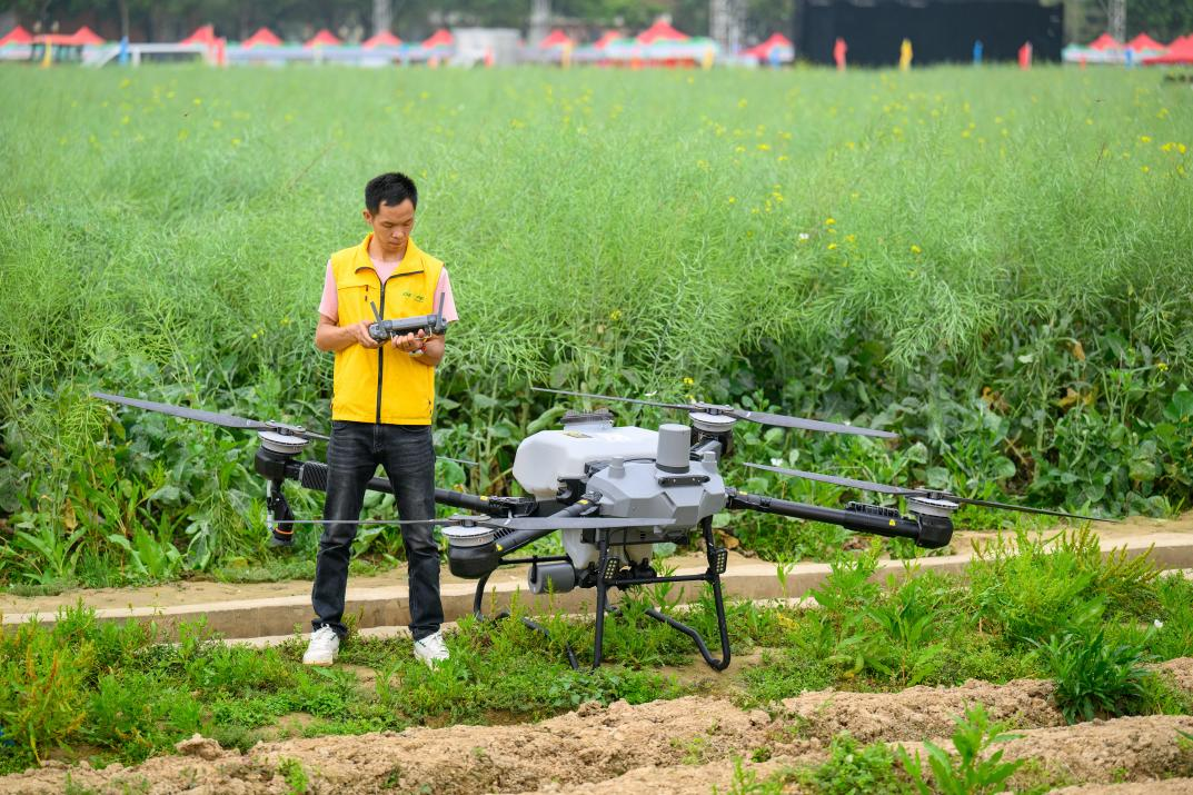 △ 2024年3月18日,廣東省東莞市石碣鎮(zhèn)掀起春耕生產(chǎn)熱潮。圖為一名工作人員正在操作無人機。