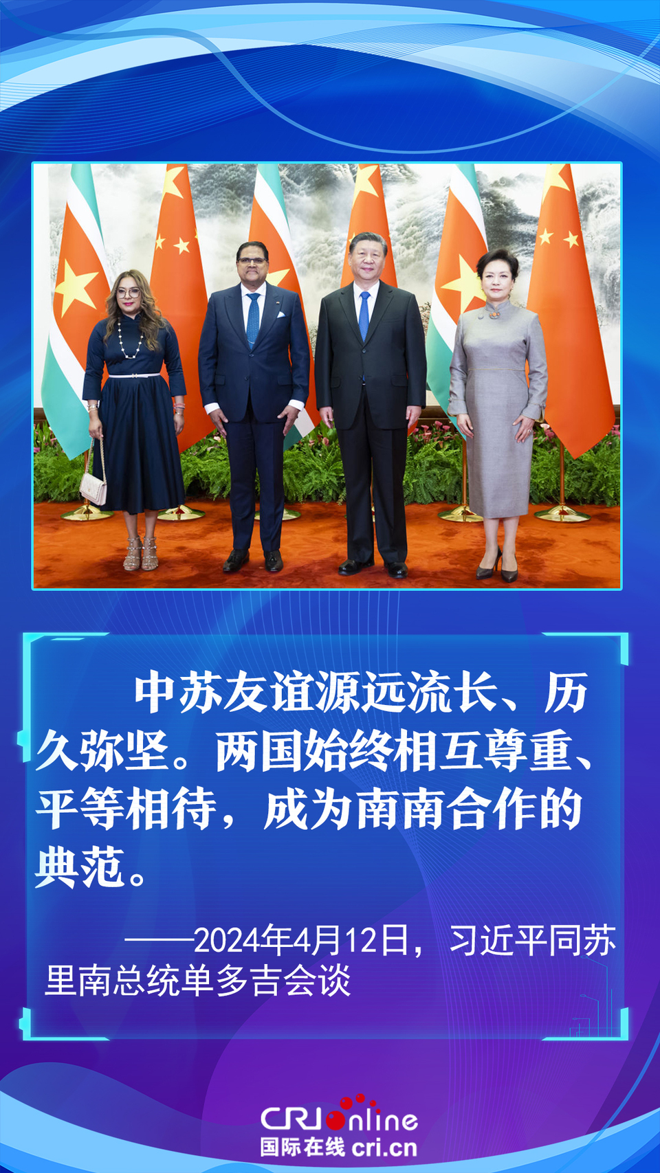 今年是中國(guó)和蘇里南建立戰(zhàn)略合作伙伴關(guān)系五周年。習(xí)近平主席在會(huì)談中以“源遠(yuǎn)流長(zhǎng)、歷久彌堅(jiān)”為中蘇友誼增添了新的注解,為推動(dòng)構(gòu)建更加緊密的中蘇戰(zhàn)略合作伙伴關(guān)系指明了方向。