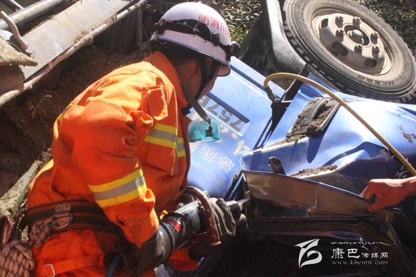 接警后,支隊指揮中心賡即調(diào)集1臺搶險救援車和8名消防官兵火速趕往事發(fā)現(xiàn)場,實施救援。10時43分左右,消防官兵抵達事發(fā)現(xiàn)場。經(jīng)現(xiàn)場調(diào)查,了解側翻卡車是因剎車失靈發(fā)生事故,車頭被嚴重擠壓變形,駕駛室中有一名被困人員被卡住無法動彈?,F(xiàn)場情況十分緊急,指揮員立即組織安全員對事故現(xiàn)場安置警戒帶、警戒標識;破拆小組利用液壓擴張剪斷器等救援器械對車內(nèi)被困人員實施破拆救援。20分鐘后,在消防官兵的努力下,受困人員被成功救出。