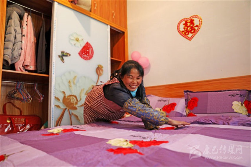 張進(jìn)芬正在整理兒子兒媳的新房床鋪。王曦 攝