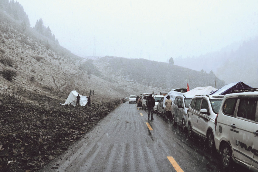然而,高原的天、娃娃的臉,說變就變。剛剛還艷陽高照的晴好天氣,瞬間寒風(fēng)四起,鵝毛大雪不一會便覆蓋了整個(gè)山野。由于到達(dá)蟲草采集點(diǎn)還需4、50分鐘人力轉(zhuǎn)運(yùn)物資,受天氣影響,前行受阻,擔(dān)任護(hù)送任務(wù)的民輔警當(dāng)即幫助群眾搭建臨時(shí)安置點(diǎn),風(fēng)雪中警民互助的身影像極了一家人。一切收拾停當(dāng),盡管風(fēng)寒雪大,條件艱辛,樂觀的群眾和伴隨服務(wù)的民輔警還不忘在風(fēng)雪中來一張合照,他們說,這是歷年來的慣例,每次上山采集蟲草和下山返程,他們都會一個(gè)不少地拍張“全家?!保源肆裟钕x草季警民相依的美好記憶。