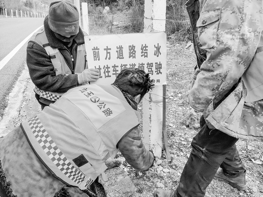 冬季氣溫下降,在夜晚形成結(jié)冰現(xiàn)象,易造成汽車打滑,難以控制,對過往車輛安全造成極大威脅。白玉公路分局出動人員 450 人、 車輛72輛次,對管養(yǎng)轄區(qū)道路全線進行警示牌的安裝。同時,對有暗冰、陰山積雪等路段及時拋灑防滑沙和融雪劑,確保道路行駛安全。