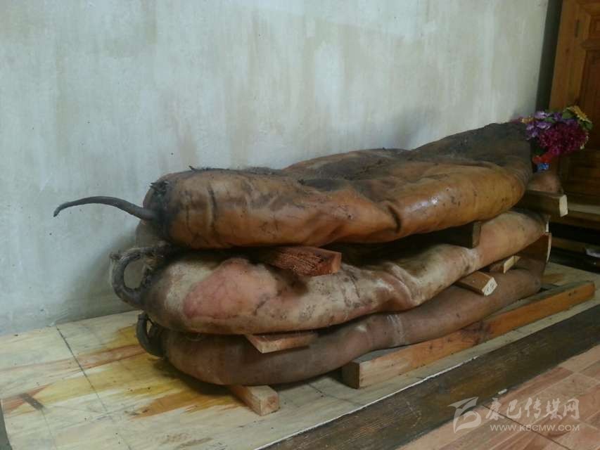 半干豬肉:在丹巴縣革什扎鄉(xiāng)有一種比較奇特的豬肉保存方法:將豬殺死后,不去毛,只在豬的腹部開一條口子取出內臟,將血水清理干凈后用麻繩將腹部縫合。隨后用當地的黃泥漿敷在豬身上,在豬的身上形成一個厚約2厘米的殼,密不透風。處理好后將其懸掛于灶塘之上,使黃泥在高溫的烘烤下快速硬化。如若發(fā)現(xiàn)黃泥層出現(xiàn)裂縫,立即用黃泥漿將其修復。等到第二年熱天時,敲掉黃泥形成的硬殼,豬毛被輕松退去,豬肉依然比較新鮮。但這種保存新鮮豬肉的方法現(xiàn)在已經很少見了,一是因為這種保存方法風險太大,稍有不慎豬肉就可能腐敗;二是如今物資供應豐富,新鮮豬肉購買方便,使得此種儲存方式失去了存在的價值。