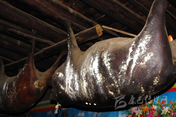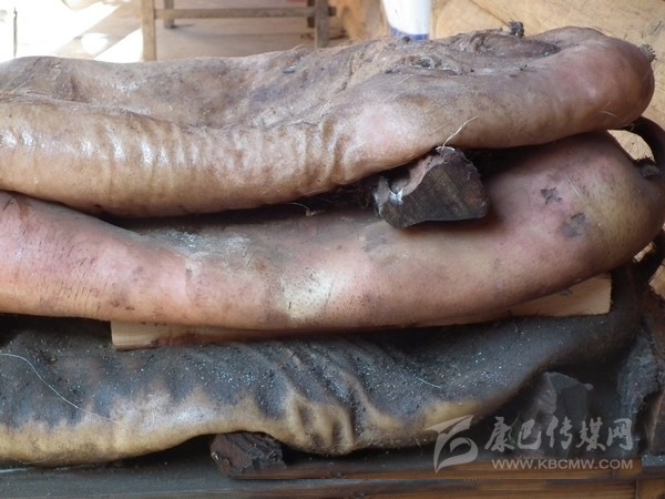 豬膘:在丹巴,豬膘是一種貯存豬肉的方式,是一種飲食習俗,同時,它又是財富的象征。在丹巴隨便走進一戶人家都可以看到少則幾扇、多則十余扇的豬膘掛在樓上,有些人家的豬膘甚至還貯存十多年之久。這些豬膘大多已經被蟲吃掉了許多,但是他們也不會心痛,因為在過去,看一個丹巴人家庭是否富裕,就看他家有多少豬膘,豬膘越多就越富有。
