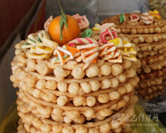 卡賽是藏族人過年必備的美食。用酥油、菜油、豬油等炸成多種面食,類似麻花、油條之類。多在藏歷年時(shí)食用。分為耳朵形、蝴蝶形、條形、方形、圓形等各種形狀,涂以顏料,裹以砂糖。既是裝飾神案的藝術(shù)品,又是款待客人的佳肴?!翱ㄙ悺钡钠贩N花色常常成為女主人勤勞、智慧和熱情的象征,在節(jié)日里分外引人注目。
