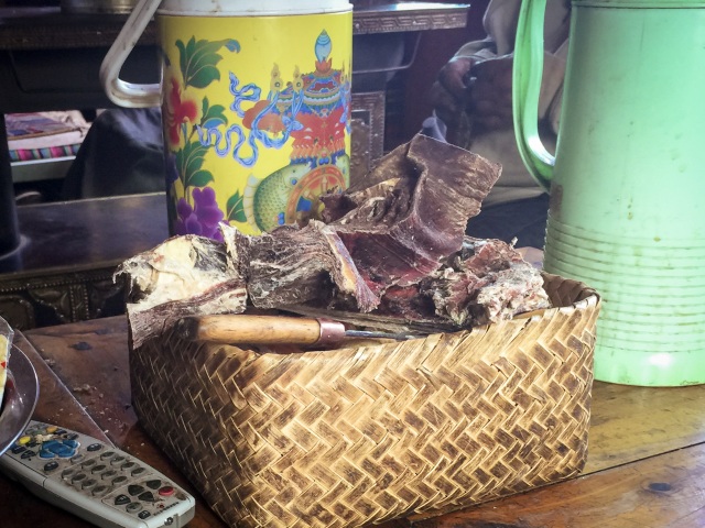 第二種吃法是,風干坨坨肉,通常是帶骨的風干肉,需要用藏刀割著吃,這也是最傳統(tǒng)的游牧藏族食肉方式。