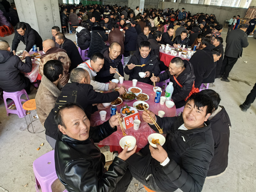 在鞭炮聲中,紅燒牛肉、干燒海參、夾沙肉、咸燒白......一道道熱氣騰騰的菜肴端上飯桌,建筑工友們高高舉杯,互道祝福,喜迎新年。